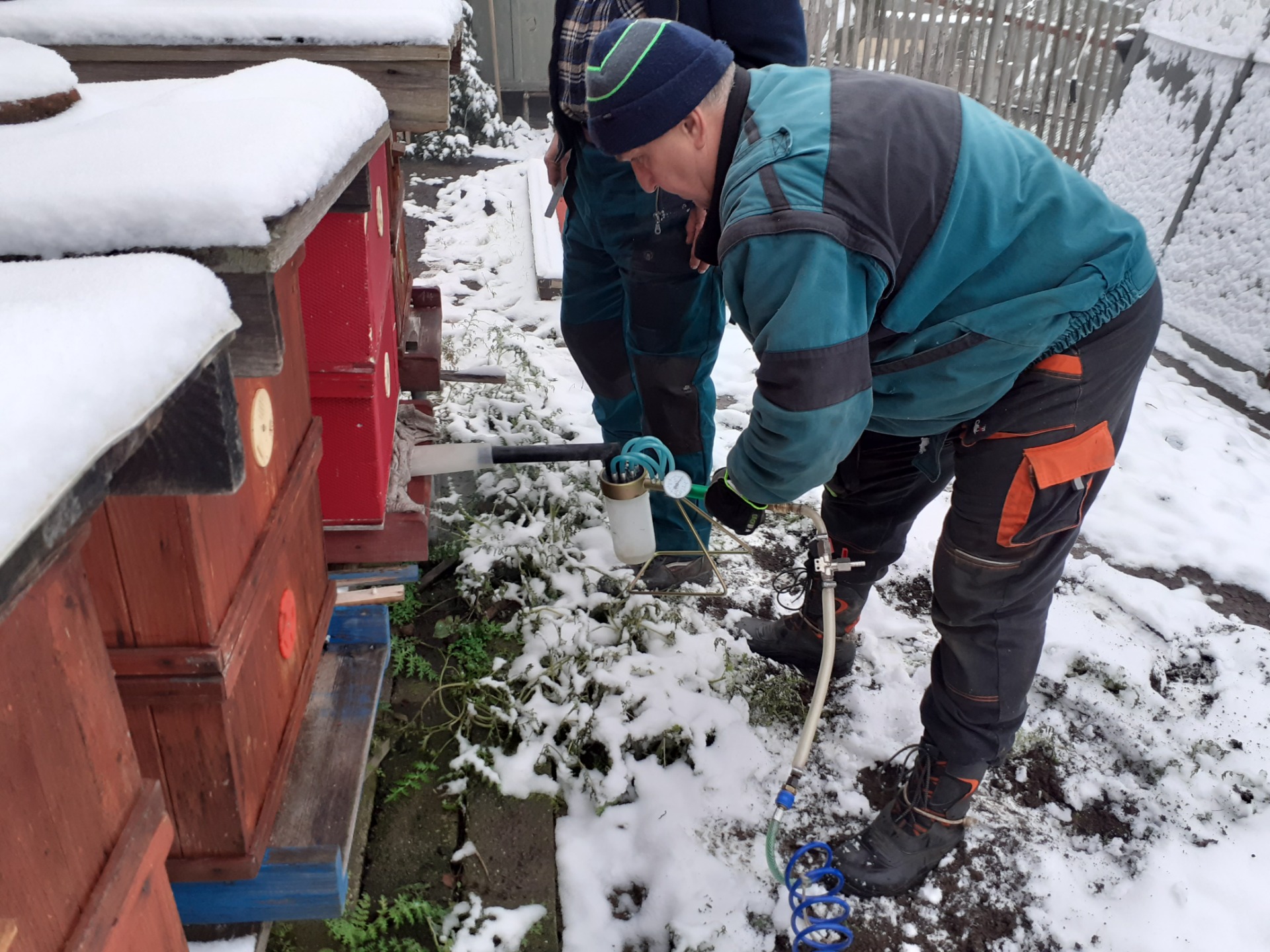 Včera a dnes proběhlo ošetření aerosolem u 126 včelstev v okolí Vysoké Pece, Březence, Zaječic, Strupčic a Pesvic.